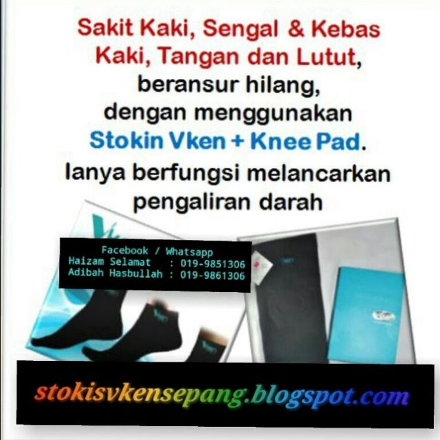 See more of Stokin Vken Rawat Pulih on Facebook. Penyembuhan dan pembaikan akan terjadi dengan berkesannya secara semulajadi melalui kesan dari sinaran inframerah jauhSIJ dan ion-ion negatif dalam produk-produk Vken. Disebabkan bahan pembuatan stokin Vken adalah terdiri daripada bahan-bahan semulajadi maka tiada langsung elemen dadah atau bahan kimia lain yang terlibat.